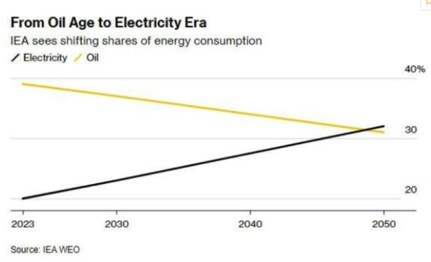 图:从石油年代转向电力时代(IEA预计能源消费份额正在发生转变,黑线指电力,黄线指石油)