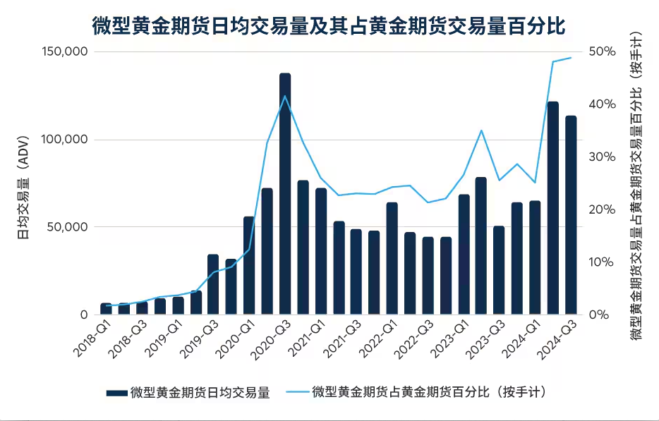 芝商所的微型黄金和白银期货合约为个人投资者量身定制,与较大规模的的黄金和白银期货合约相比,资本投入和保证金更低,交易费用也更低,但灵活性、安全性和保障性相同。随着市场波动的加剧,芝商所的微型黄金期货和微型白银期货创下了产品历史上日均交易量第三大的季度,分别达到113,492份合约和20,224份合约。