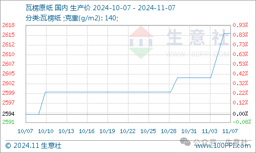 据生意社商品行情分析系统:本周瓦楞纸价格呈现上浮态势。截止11月7日,瓦楞原纸140g出厂均价为2616元/吨,与11月1日均价2600元/吨相比上涨了0.46%。