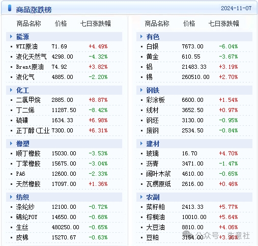 | 商品 | 行业 | 11月7日 | 单位 | 日涨跌 |