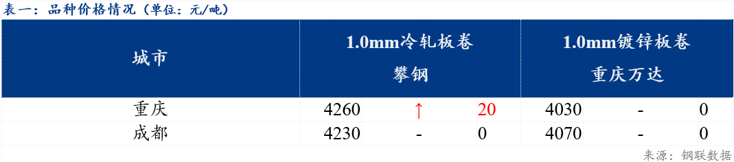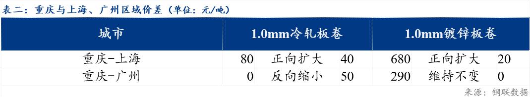 重庆、上海地区冷轧板卷区域价差扩大40元/吨;重庆、广州冷轧板卷区域价差反向缩小50元/吨。重庆、上海镀锌板卷区域价差扩大20元/吨;重庆、广州镀锌板卷区域价差维持不变。镀锌、冷轧品种价差反向扩大20元/吨;镀锌、热轧品种价差扩大30元/吨 ;冷轧、热轧品种价差扩大50元/吨。