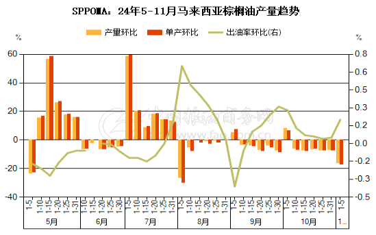(1)11月上旬,马来西亚棕榈油产量继续下滑,导致棕榈油价格继续大涨。因南亚降雨偏多,9、10、11月份南亚棕榈油生产情况达不到预期。马来西亚南部棕果厂商公会(SPPOMA)数据显示,11月1-5日马来西亚棕榈油产量环比下降16.63%。