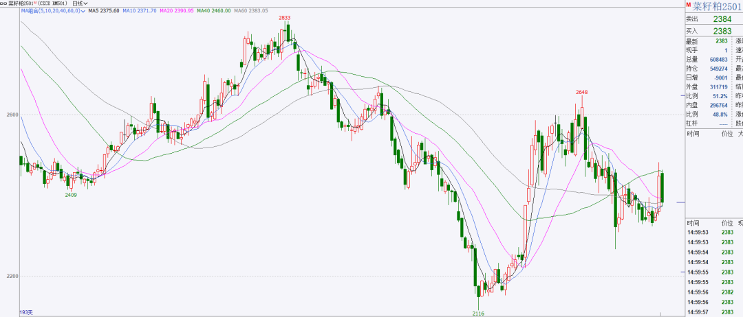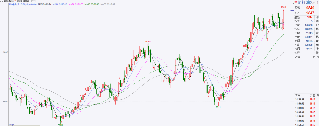 因油脂供应端相对紧张,今日国内菜油出现大涨,截至收盘,郑州菜油主力2501合约收于9847元/吨,日涨289元/吨,涨幅达到3.74%。郑州油菜籽同样大幅收涨,但因其仓量非常有限,参考价值不及菜油。