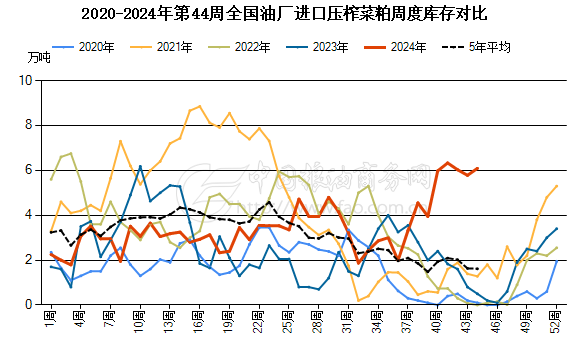 (3)粮油商务网监测数据显示,截止到2024年第44周末,国内进口压榨菜粕库存量为6.1万吨,较上周的5.8万吨增加0.3万吨,环比增加5.36%。