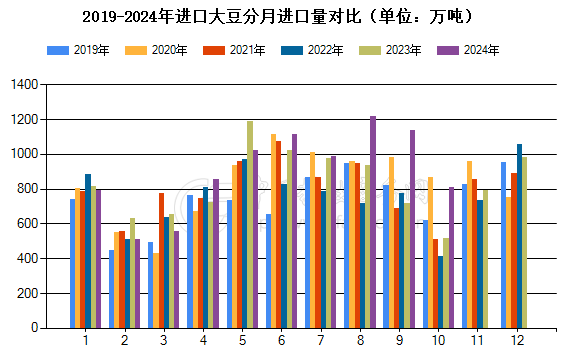 (1)海关数据显示,2024年10月进口大豆进口总量为808.7万吨,进口量同比去年增加56.82%。较上月同期的1137.09万吨减少328.39万吨。数据统计显示,2024年1-10月进口大豆累计进口总量增加10.08%。