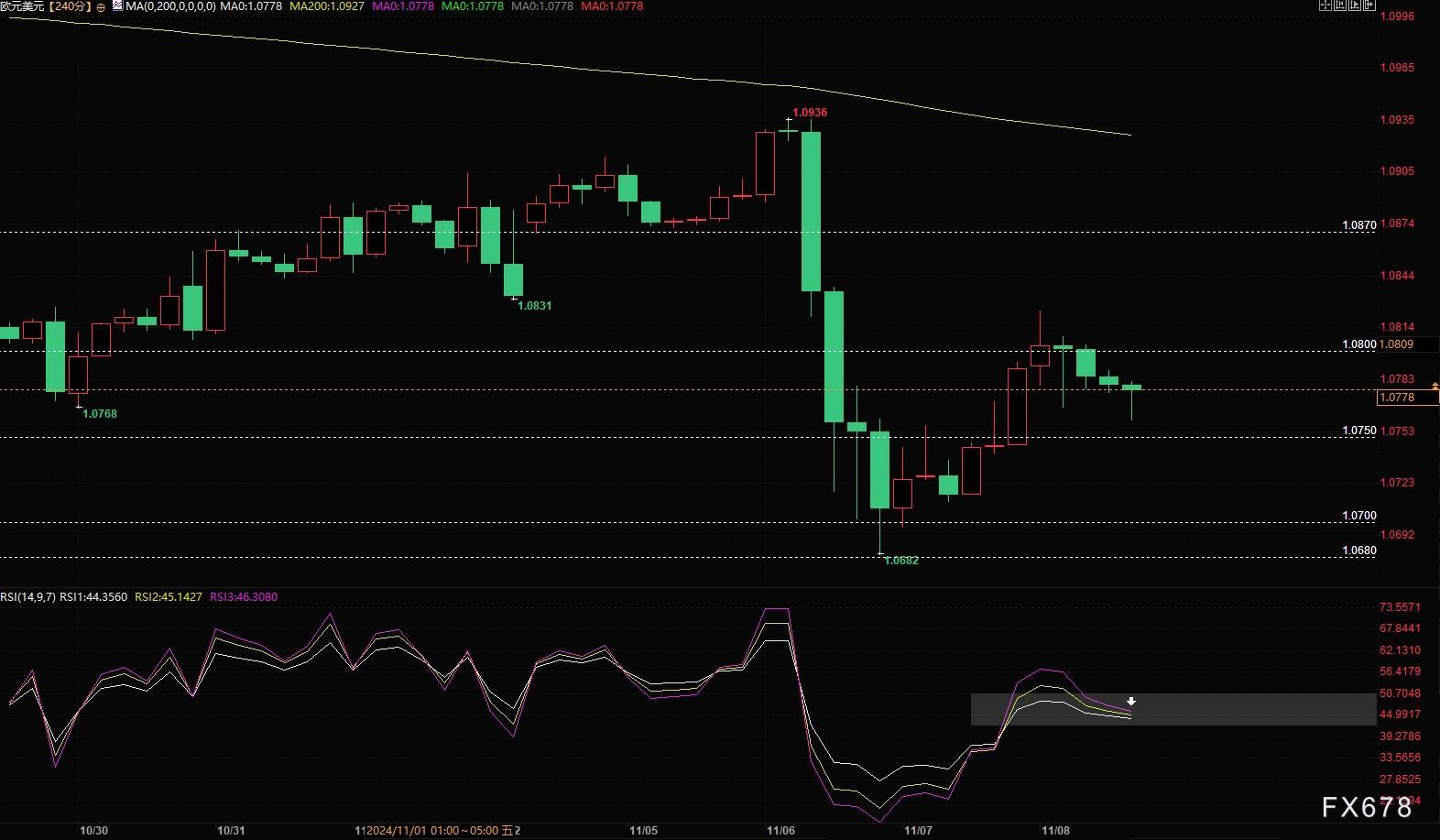技术方面,欧元兑美元4小时图上的RSI指标仍然保持在50以下,这表明在周四(11月7日)的修正之后,下跌趋势仍然存在。外汇分析师Eren Sengezer认为下行方面,1.0750为静态支撑位,其次是1.0700和1.0680。向上看,初步阻力位于1.0800,之后是1.0870(200日均线)。