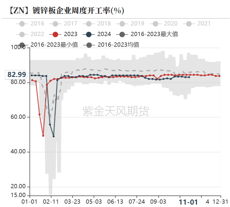本周镀锌开工率录得56.6%,较上周增加1.15个百分点。在原料库存方面,由于本周锌价高开震荡,且受环保限产影响,企业采买积极性降低,刚需补库为主,整体原料库存下降。