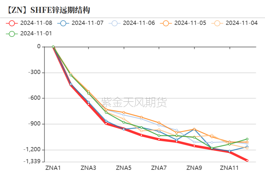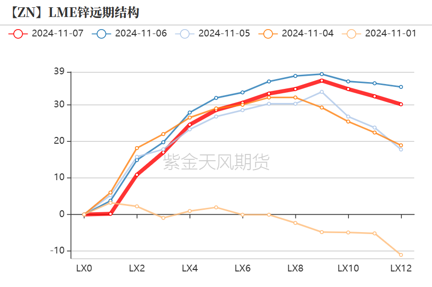 结构上看,内盘维持back结构,外盘多头头寸及仓单集中度显著下行,LME锌0-3升水走弱至-21美金附近。