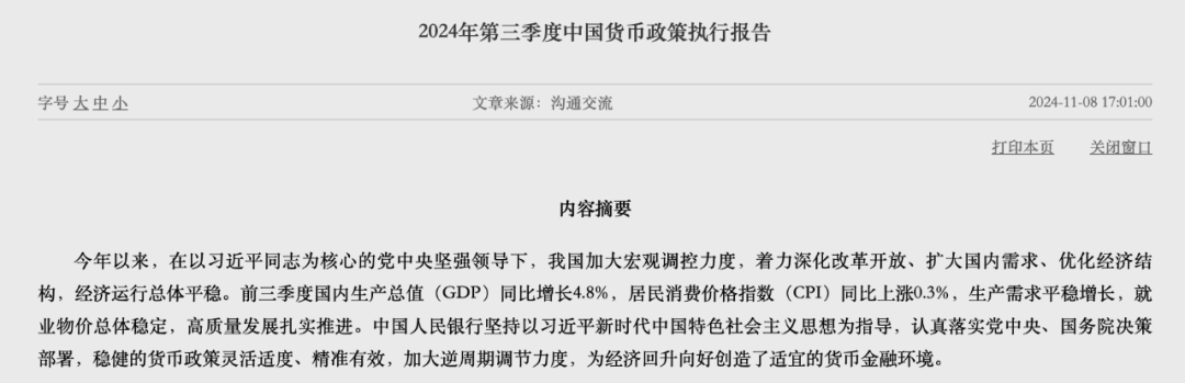 11月8日,中国人民银行发布2024年第三季度中国货币政策执行报告(下称《报告》)。《报告》显示,今年以来,稳健的货币政策灵活适度、精准有效,加大逆周期调节力度,为经济回升向好创造了适宜的货币金融环境。