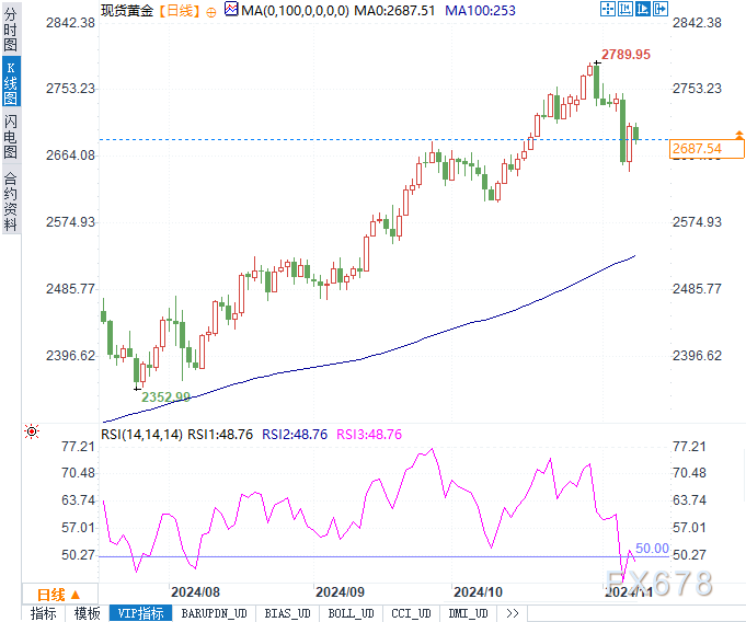 现货黄金当前报2689.76美元/盎司,跌幅0.61%,在美国政局变动引发的短暂避险浪潮后,黄金未能进一步走高。市场观察到,特朗普胜选引发的通胀预期刺激了美元走强,打压了黄金的上行动力。随着美联储对未来利率走势的谨慎表态,黄金多头虽有支持,但涨势仍然受限。