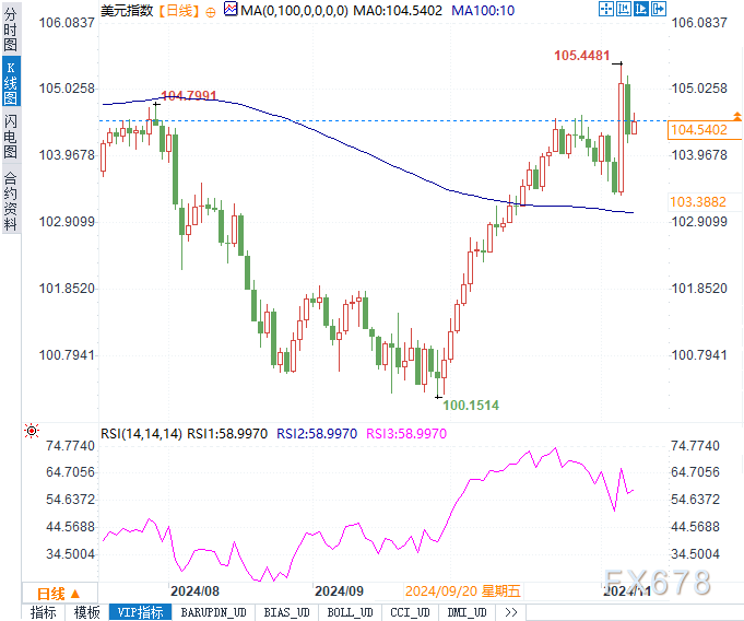美元指数报104.5012,涨幅0.16%,呈现出良好的支撑态势。市场情绪受到特朗普当选所带来的未来加征关税预期的刺激,导致美元指数上涨,欧元、英镑等非美货币承压。