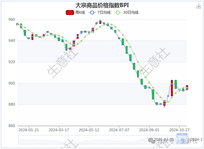 11月8日大宗商品价格指数BPI为898点,较昨日上升了4点,较周期内最高点1343点(2021-10-19)下降了33.13%,较年内最低点877点(2024-09-24)上涨了2.39%。