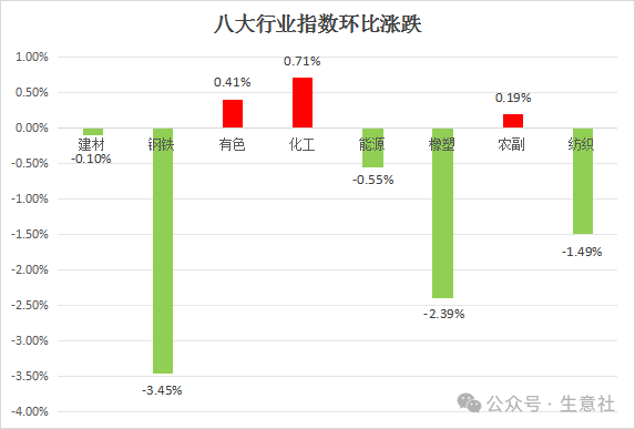 个行业,本周涨多跌少,上涨前三的分别是建材行业,涨幅为0.94%,钢铁行业,涨幅为0.90%,有色行业,涨幅为0.74%;下跌的仅纺织行业,跌幅为-0.13%。