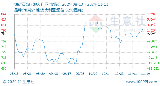 11月11日生意社铁矿石(澳)基准价为799.89元/吨
