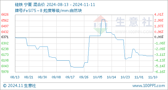 11月11日,生意社硅铁基准价为6160.00元/吨,与本月初(6200.00元/吨)相比,下降了-0.65%。