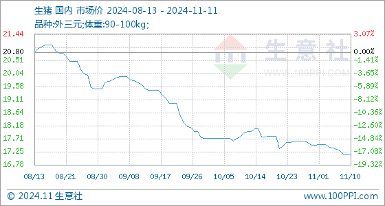 11月11日,生意社生猪基准价为17.17元/公斤,与本月初(17.47元/公斤)相比,下降了-1.72%。