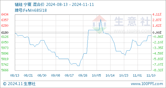 11月11日,生意社锰硅基准价为6144.00元/吨,与本月初(6070.00元/吨)相比,上涨了1.22%。