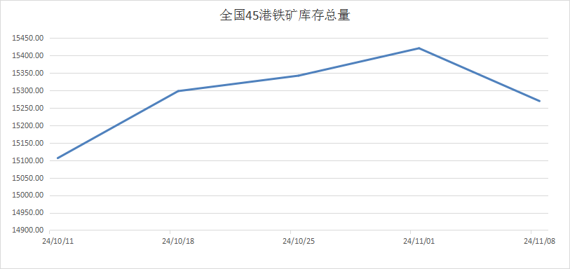 库存方面,截至11月8日,全国45个港口进口铁矿库存为15269.06万吨,环比减少150.92万吨;日均疏港量为314.39万吨,周环比减少5.73万吨;在港船舶数109条,与上周相比增加5条。上周铁矿港口库存情况如上图;全国钢厂进口铁矿库存总量为9130.51万吨,周环比增加132.61吨。上周港口疏港量下降,港口库存转为去库。钢厂有意维持现有生产规模,但本周港口到港量回升,港口库存有累库可能,本周仍需要多关注港口铁矿库存变化。