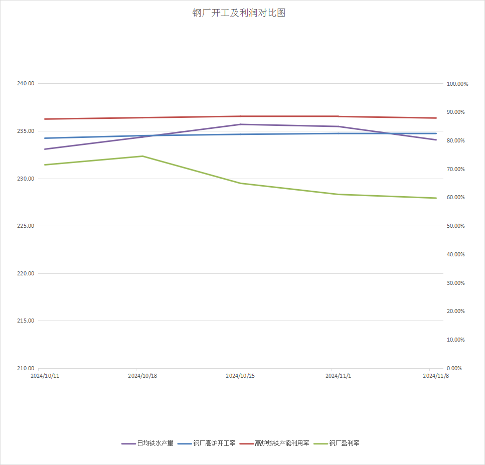 需求方面,截至11月8日,钢厂高炉开工率82.29%,周环比下降0.15%;高炉炼铁产能利用率87.87%,环比下降0.53%;钢厂盈利率59.74%,环比下降1.3%;日均铁水产量234.06万吨,环比减少1.41万吨;当前样本钢厂的进口矿日耗为289.96万吨,环比减少0.59万吨。上周钢厂开工情况、铁水产量略有下降。上周下游钢材行情有所回落,因此铁钢厂生产利润也随之下降,但钢厂生产积极性尚可,高炉复产操作增加,铁矿需求释放预增。现阶段钢厂利润水平尚可,据上周钢厂停复产计划来看,本周复产量多于检修量,本周钢厂采购幅度预增,预计本周铁矿需求释放有所增加。