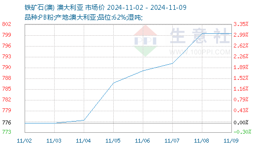 据生意社商品行情分析系统显示,上周(11.2-11.9,下同)铁矿价格窄幅震荡运行。截至9日,生意社铁矿价格指数为799.89,环比上行3.05%,具体如上图。上周铁矿行情震荡为主,临近周末出现小幅反弹,其主要原因国内外宏观环境变动较大,影响期货市场行情波动,大多数贸易商交易谨慎,放缓采购节奏;钢厂谨慎观望居多,铁矿采购操作减少,行情转淡;铁矿供需双弱,港口库存开始去库,所以上周铁矿价格窄幅震荡,偏强运行。