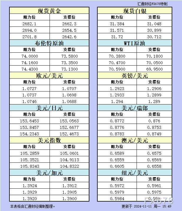 汇通财经APP讯——11月11日欧市更新的黄金、白银、原油、美元指数、欧元、英镑、日元、瑞郎、澳元、加元、纽元支撑阻力位一览。