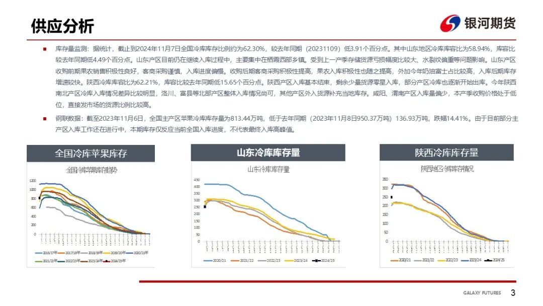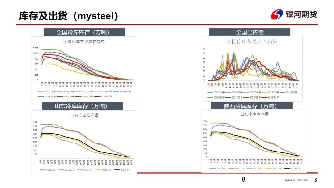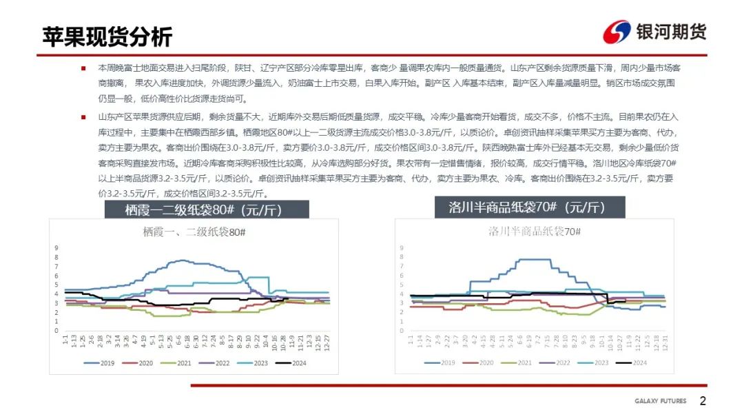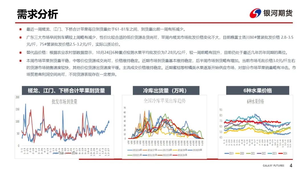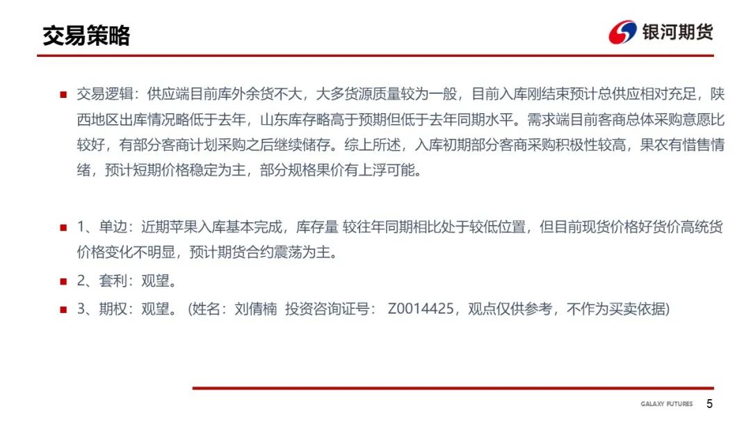 苹果:销区走货好转山东产区入库量持续增加 基本面:销区晚熟富士销售好转,低价果接受度较好,新季果糖度高,口感较好。陕西产区目前陕北地区入库量约7-8成左右,基本收尾中,地面货不多,目前库容比57%左右。山东产区好货价格稳定,霜降过后表光不好的货价格有所下调0.2-0.3元,入库进行中,部分客商收购结束,果农被动入库增加。卓创数据库存量792万吨左右,少于去年。 盘面:期价跟随现货价格走势,受现货价格及入库影响,有所反弹,短期下方有所支撑。 操作策略:AP2301震荡反弹,目前总体库存量低于去...