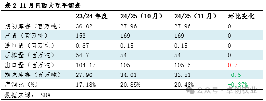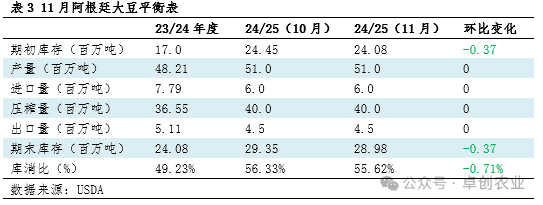 11月报告显示,阿根廷24/25年度产量为5100万吨,环比稳定。本次报告整体收紧,平衡表调整基本符合预期,目前阿根廷大豆播种进度为7.6%,市场没有更多的产量调整窗口。而23/24年度的产量预估环比上调11万吨,进口量上调39万吨,压榨量上调85万吨,进口量上1万吨,综合导致期末库存下调37万吨。因此,本次24/25年度平衡表唯一的变动便来自期初库存的变化。
