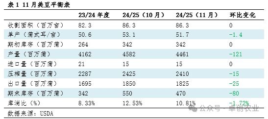 根据美国农业部24/25年度的供需平衡表数据显示,11月平衡表的库销比为10.81%,环比下降1.72%。11月美豆平衡表变动较大,核心变量在于单产。本次单产意外下调1.4蒲式耳/亩至51.7蒲式耳/亩,带动产量预估下调1.21亿蒲式耳至44.61亿蒲式耳。USDA对此调整的解释是产量变动最大的来源是爱荷华州、伊利诺伊州和明尼苏达州。前期的中西部偏干旱的天气可能是引发产量预估下调的主要原因。