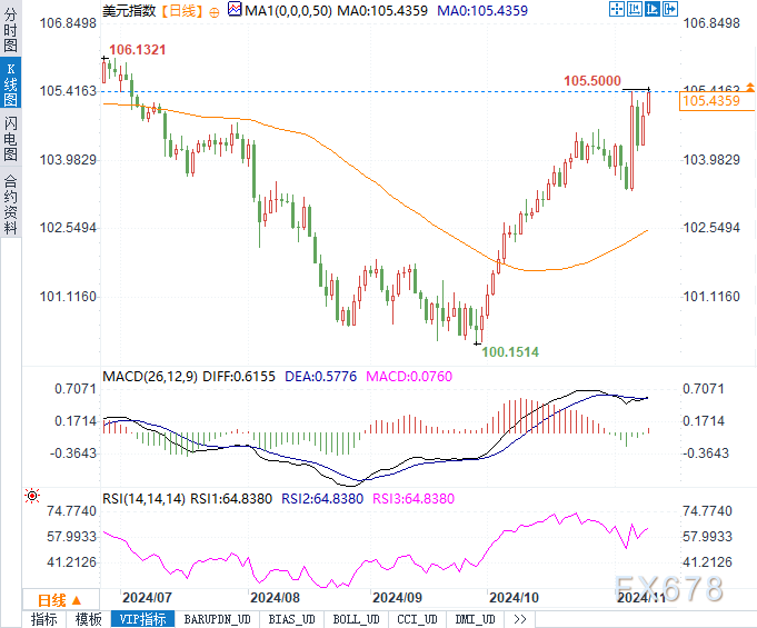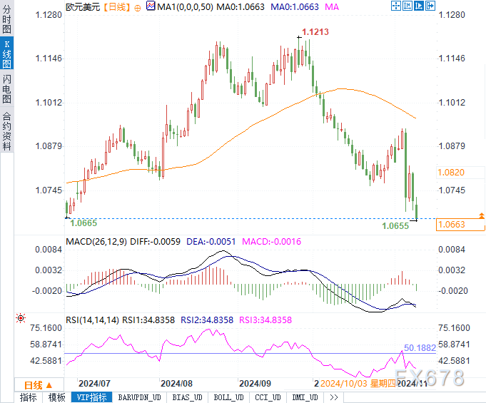 截至北京时间19:25,美元指数上涨0.47%,报105.4453,显示出市场对美元的青睐。特朗普再度当选总统后,市场对于其税收改革及宽松政策的预期推高了美元,导致避险资产需求下降。与此同时,欧元和英镑兑美元下跌,欧元兑美元报1.0662,跌幅达0.50%;英镑兑美元跌0.26%,报1.2883。