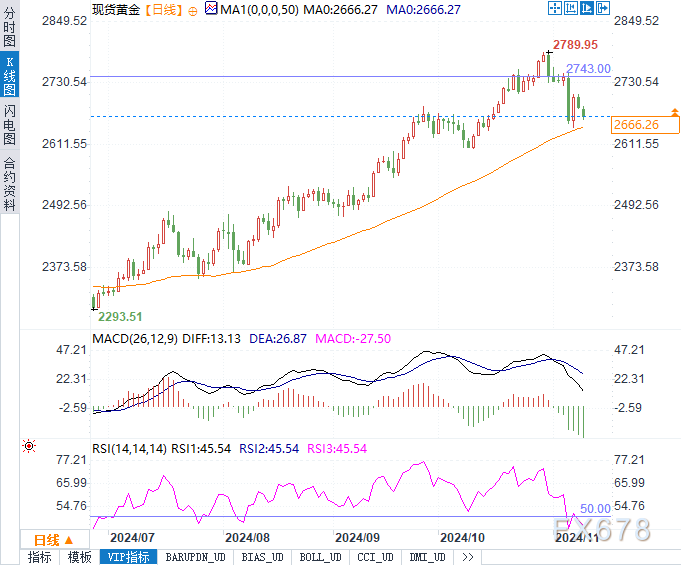 在周一(11月11日)交易日,黄金市场延续上周的回调走势,现货黄金在日内下跌近0.69%,报2666.10美元/盎司。上周五,随着美国前总统特朗普在大选中胜出,市场对未来利率路径的担忧加剧,导致黄金承压下行,成为近期的下行主导因素。本周市场将密切关注美联储官员的讲话,特别是美联储主席鲍威尔的公开讲话,将为未来利率走向提供更多线索。
