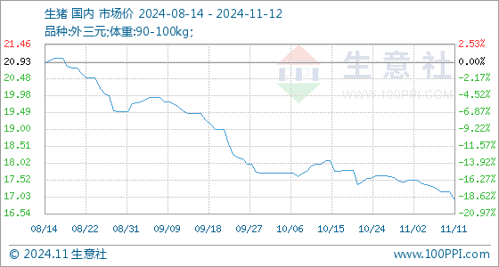 11月12日,生意社生猪基准价为16.95元/公斤,与本月初(17.47元/公斤)相比,下降了-2.98%。