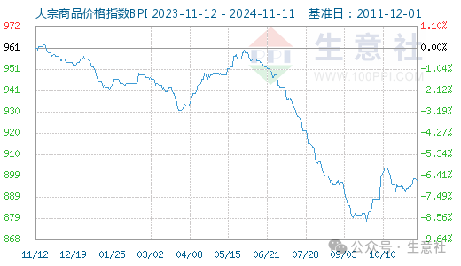 11月11日大宗商品价格指数BPI为897点,较昨日下降了133.21%35.91%