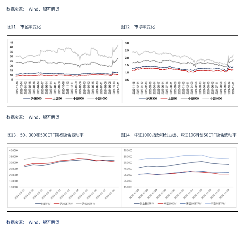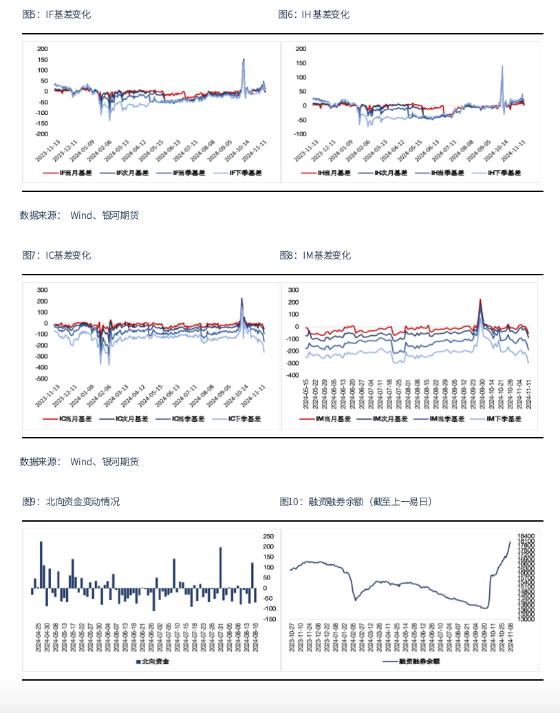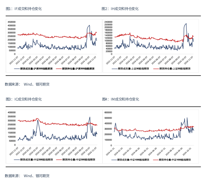 股指期货随现货分化,至收盘,主力合约IH2412跌0.62%,IF2412涨0.29%,IC2412涨0.84%,IM2412涨1.66%。由于期货尾盘未跟随现货走强,各品种基差下行,特别是IC、IM收盘贴水扩大。IC、IF、IH和IM成交分别下降11.3%、18%、22.1%和11.6%。IC、IF和IM持仓分别下降2.5%、2.5%和3.9%。