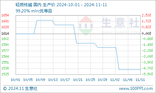据生意社商品分析系统显示,11月轻质纯碱价格先跌后稳。截止11月11日纯碱市场均价在1536元/吨,与11月1日纯碱价格1584元/吨相比,价格下调48元/吨,跌幅3.03%。