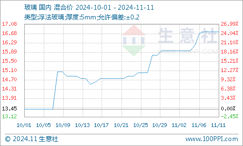据生意社商品分析系统显示,下游玻璃行情强势上涨。11月1至11日,玻璃价格从15.95元/平方米涨至16.75元/平方米相比,涨幅5.02%。玻璃市场下游需求积极性较高,厂家出货顺畅,市场去库明显,场内利好持续,玻璃价格坚挺上行。