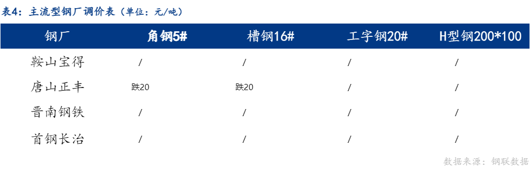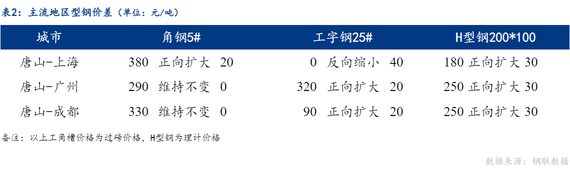从区域价差来看,唐山与上海角钢、H型钢价差正向扩大,与工字钢价差反向缩小;唐山与广州角钢价差维持不变,与工字钢、H型钢价差正向扩大;唐山与成都角钢价差维持不变,与工字钢、H型钢价差正向扩大。