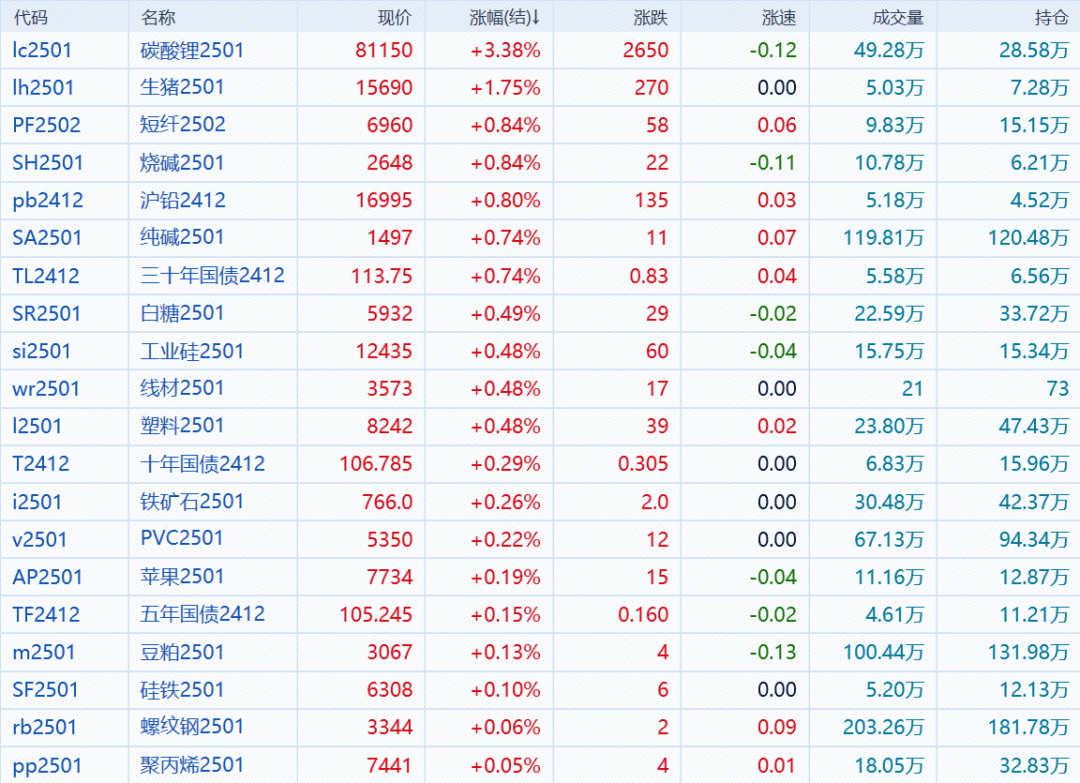 11月12日,午盘收盘,国内期货主力合约涨跌互现,碳酸锂涨超3%,生猪涨超1%,纯碱、烧碱、沪铅、短纤涨近1%。跌幅方面,菜油、丁二烯橡胶、20号胶跌超3%,沪银、豆油、沪铝、氧化铝、橡胶、SC原油、玻璃、沪金跌超2%。