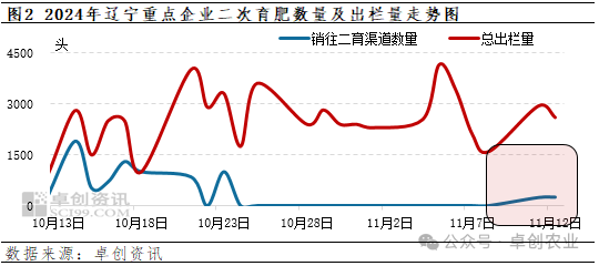 自10月24日开始,辽宁部分重点企业的生猪出栏量中,销往二次育肥户的订单已消失,出栏走向全部为屠宰端。而在11月11-12日,部分养殖企业再度出现销往二次育肥渠道的生猪订单。价格跌至16元线在一定程度上刺激养殖户再度补栏,且饲料成本较低,二次育肥补栏有一定盈利预期,若二次育肥补栏提升,则对行情有一定支撑作用。