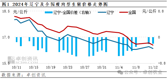 根据卓创资讯监测,11月份辽宁生猪价格呈短暂上涨后下滑再低位盘整的运行态势。2024年11月12日辽宁瘦肉型生猪交易均价16.35元/公斤,较月初累计下降0.53元/公斤,降幅3.14%。月内最高价为1日的16.88元/公斤,最低点为7-8日的16.30元/公斤,二者相差0.58元/公斤,幅度3.44%。