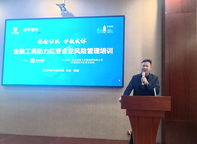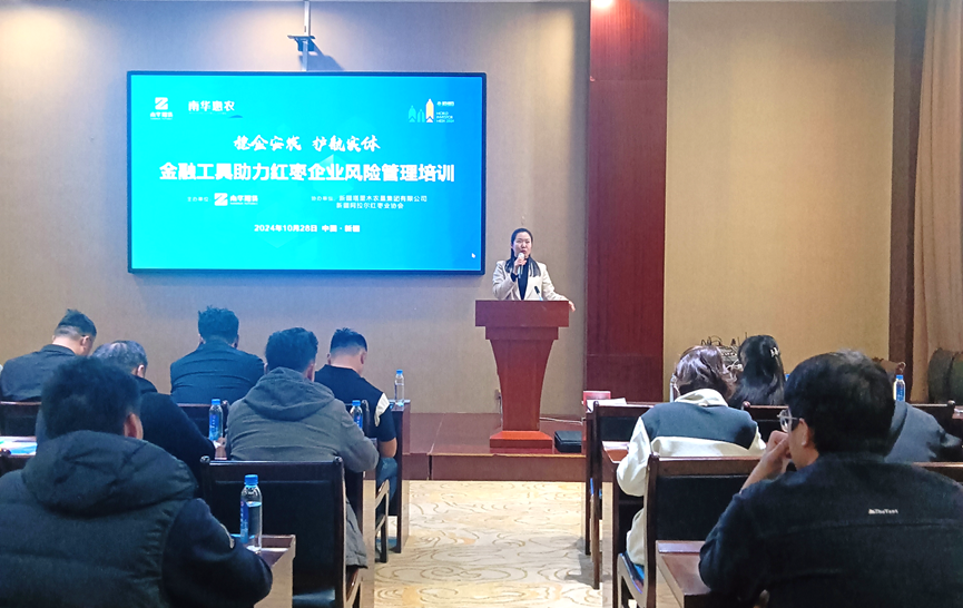 10月28日下午,由南华期货郑州营业部和新疆塔里木农垦集团共同举办的“稳企安农护航实体”——金融工具助力红枣企业风险管理培训在新疆阿拉尔市圆满结束。本次交流会邀请农垦集团、阿拉尔红枣业协会及红枣贸易商企业,旨在推广和应用红枣期货、期权衍生品工具,帮助中小企业规避风险、稳定经营,促进红枣行业的发展和创新。南华期货股份郑州营业部负责人刘红丽主持。
