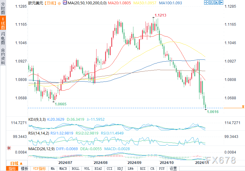 由于美元走强,欧元/美元跌至七个月低点,市场关注4月低点1.0601。进一步下跌的支撑位是2023年11月的低点1.0517。