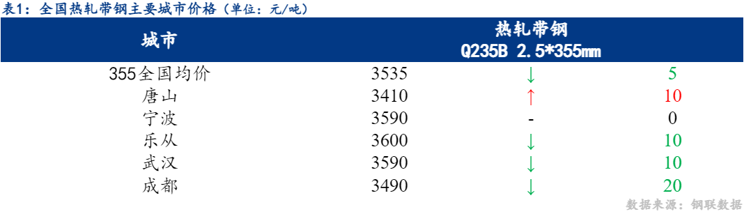 12日热轧带钢全国主要城市价格涨跌互现,截至发稿时2.5*355mm热轧带钢均价3535元/吨,较昨下降5元/吨,其中2.5*355mm主要城市报价为唐山3410元/吨,宁波3590元/吨,乐从3600元/吨。