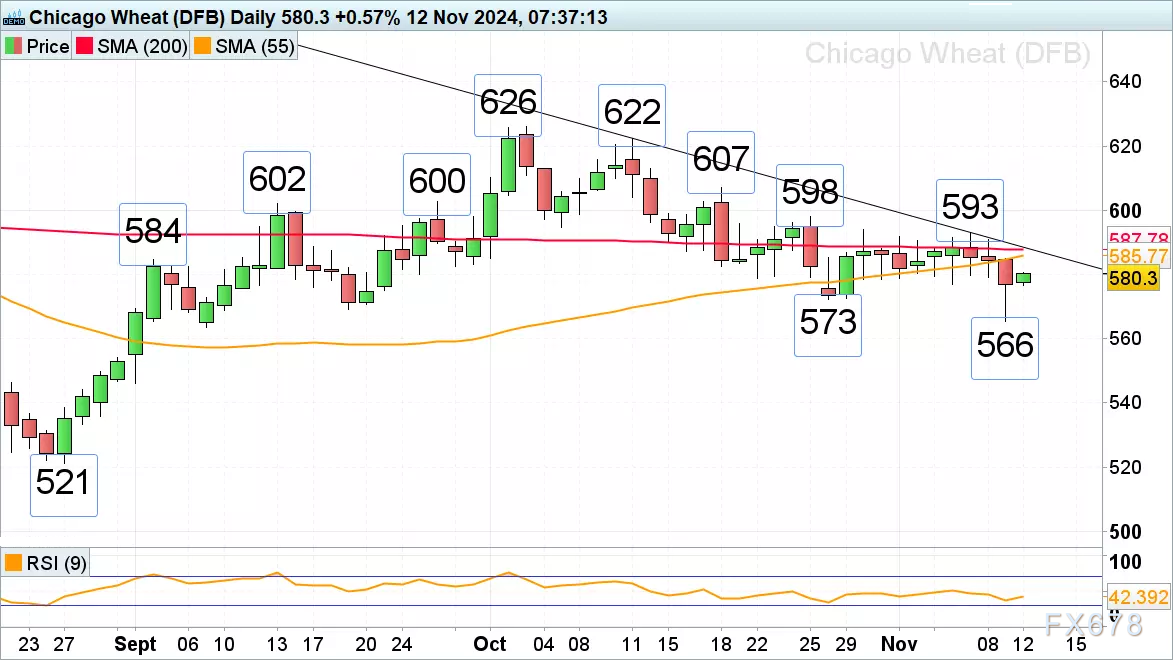 美国小麦价格从周一566的三个月低点回升,并可能重新触及586-588的55日和200日移动均线,加上10月至11月的下行趋势线,预计将达到趋势线上限。