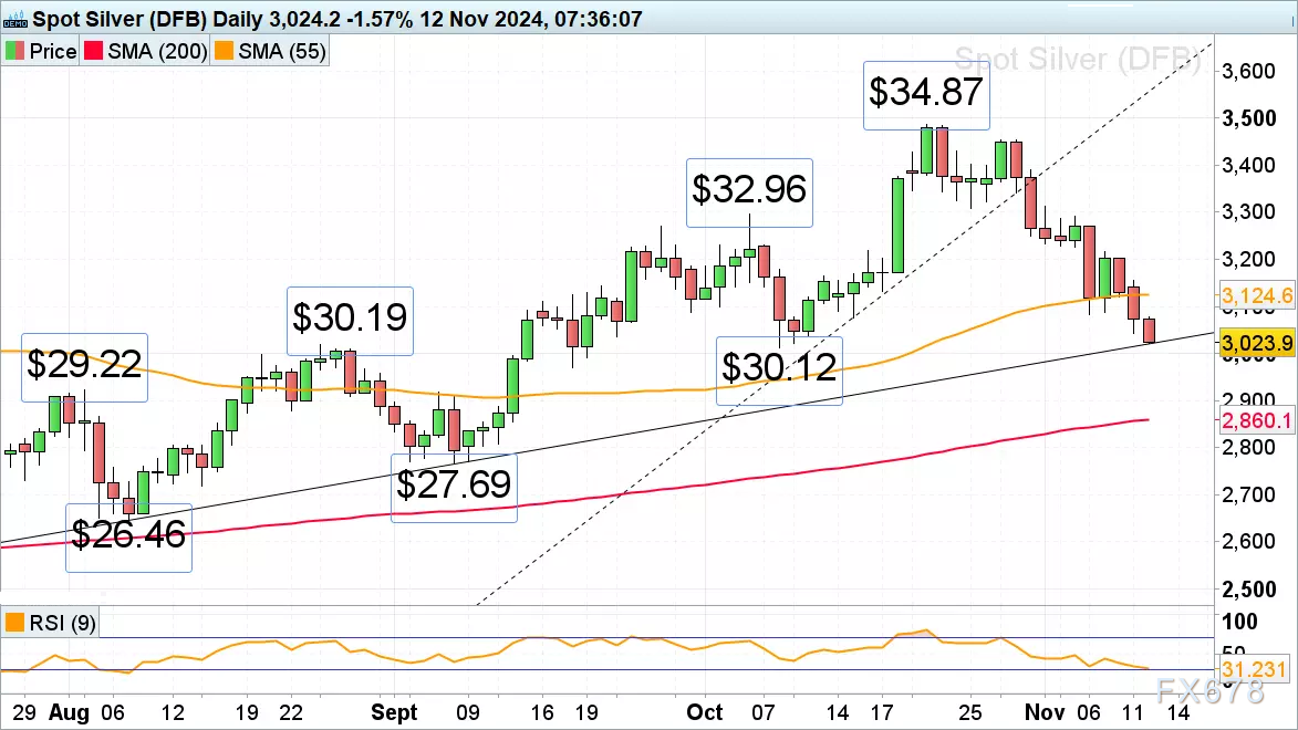 现货银价格已从每盎司34.87美元的12年高点下跌13%,目前已触及8月至11月30.19美元的上行趋势线。围绕它,最近的急剧下跌可能会暂停。反之,价格可能触及8月初的高点29.22美元。