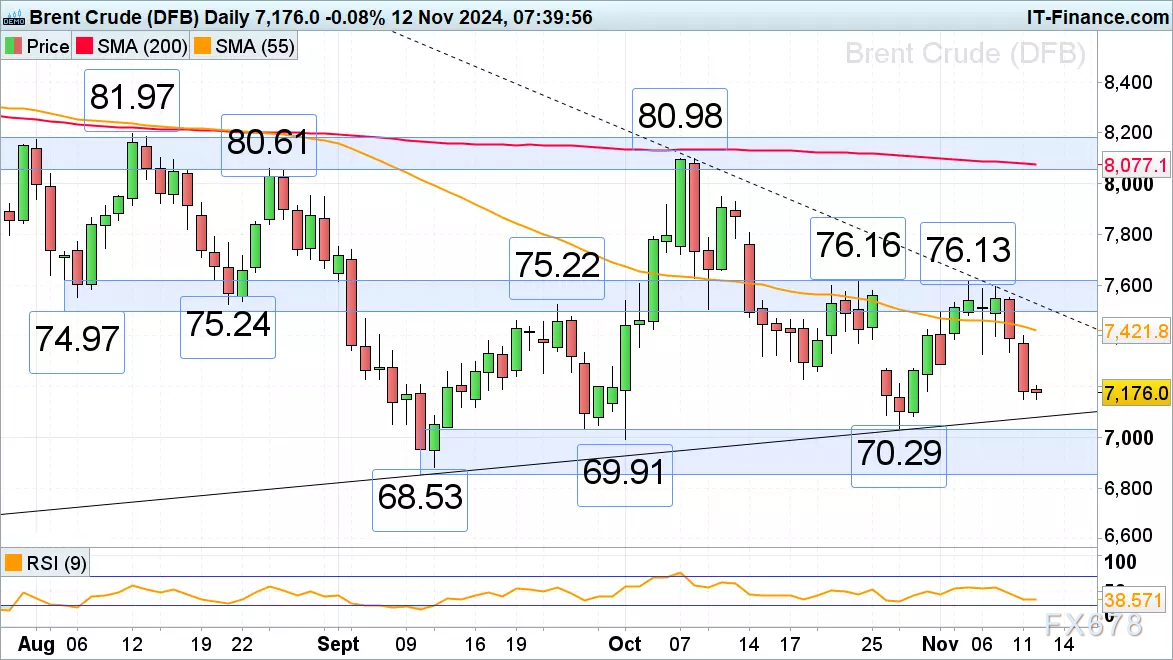 布伦特原油前沿月期货价格已从上周的76.13高点下跌逾5%,该高点位于75.24-76.16主要阻力区间内。8月份的低点,以及9月底部和10月底的高点在此阻力区间内。
