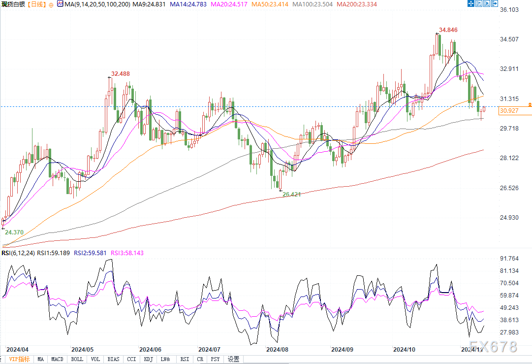 汇通财经APP讯——白银价格跌破31美元,目前交投于30.95美元附近。由于人们预期当选总统特朗普的政策将提振美国经济增长和通胀压力,美元走强,导致白银价格走弱。