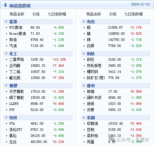| 商品 | 行业 | 11月12日 | 单位 | 日涨跌 |