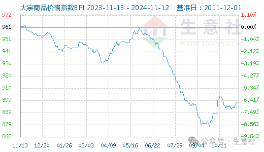11月12日大宗商品价格指数BPI为897点,与昨日持平,较周期内最高点1343点(2021-10-19)下降了33.21%35.91%