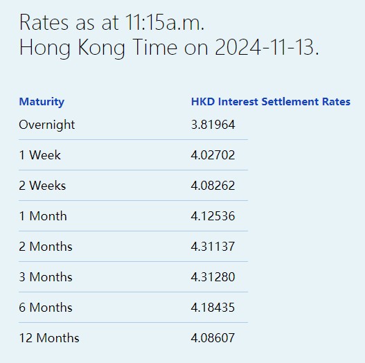 11月13日,港元拆息无大变动,其中,隔夜拆息微跌至3.81964%,见近一周新低;与楼按相关的一个月拆息连跌两天,报4.12536%。不过,反映银行资金成本的三个月拆息连升五天,报4.3128%,为10月25日后最高。