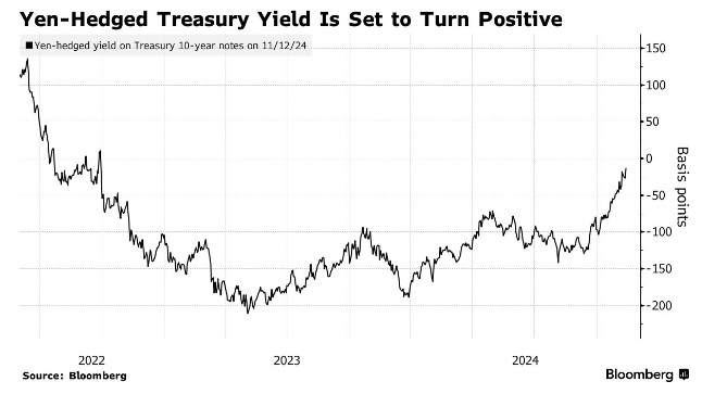 智通财经APP注意到,由于特朗普的选举胜利推高了美债收益率,而美联储的降息则降低了对冲成本,日元对冲的美国国债收益率将在两年来首次转为正值。